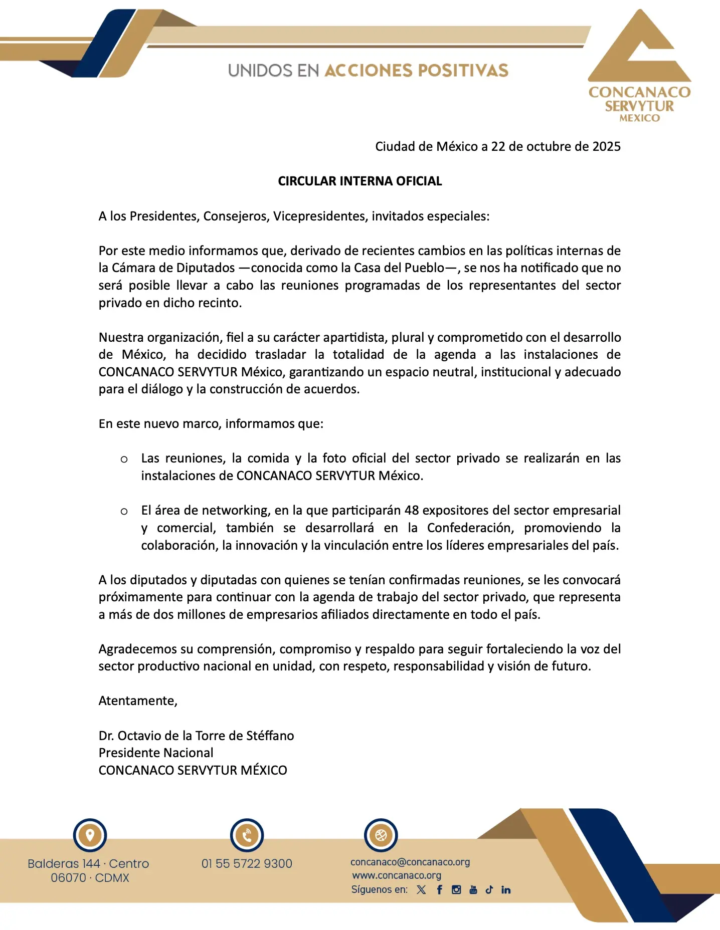Por este medio informamos que, derivado de recientes cambios en las políticas internas de la Cámara de Diputados —conocida como la Casa del Pueblo—, se nos ha notificado que no será posible llevar a cabo las reuniones programadas de los representantes del sector privado en dicho recinto.