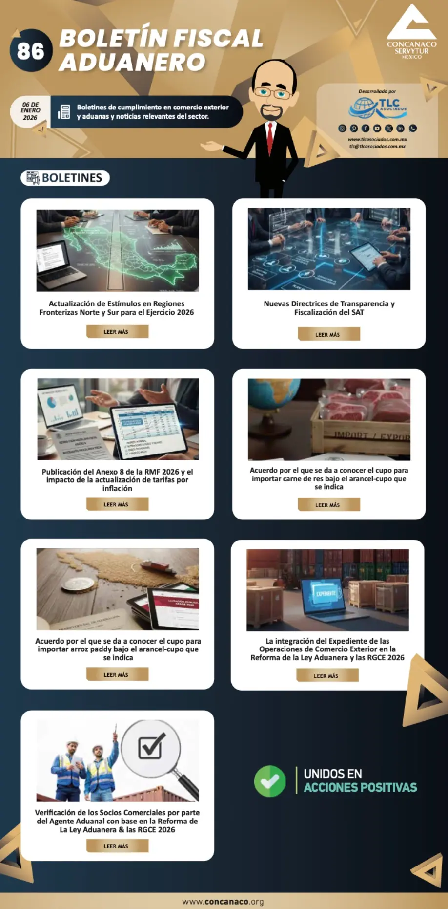 En el presente boletín, identificaremos las nuevas obligaciones que fueron asignadas al Agente Aduanal con respecto de la verificación de los socios comerciales que realizan operaciones comercio exterior, derivado de la publicación del “Decreto por el que se reforman, adicionan y derogan diversas disposiciones de la Ley Aduanera” que se dio a conocer en el DOF el 19 de noviembre de 2025 y las Reglas Generales de Comercio Exterior para 2026 publicadas en el DOF el 27 de diciembre del mismo año, que tendrán vigencia el 1 de enero de 2026.