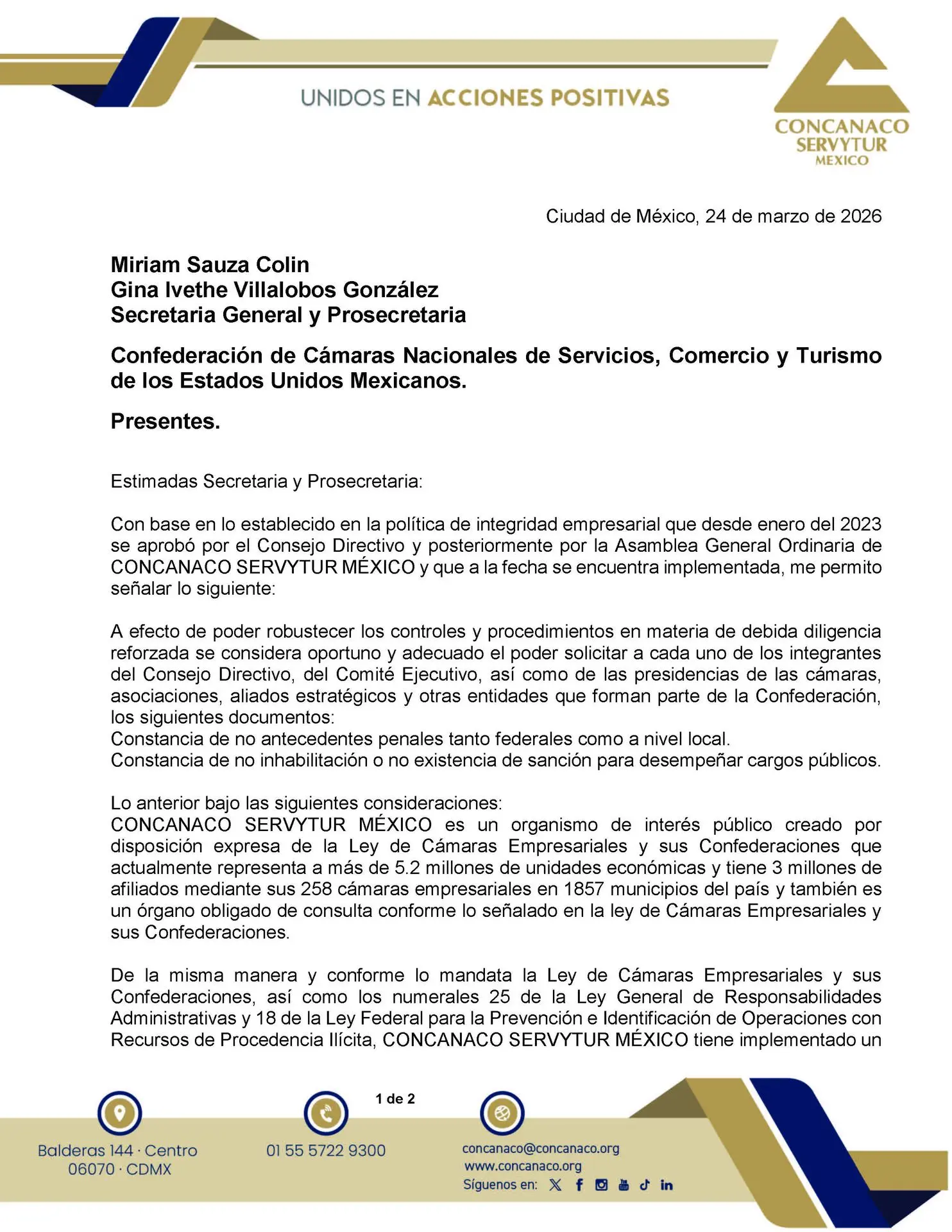 Con base en lo establecido en la política de integridad empresarial que desde enero del 2023 se aprobó por el Consejo Directivo y posteriormente por la Asamblea General Ordinaria de CONCANACO SERVYTUR MÉXICO y que a la fecha se encuentra implementada, me permito señalar lo siguiente: