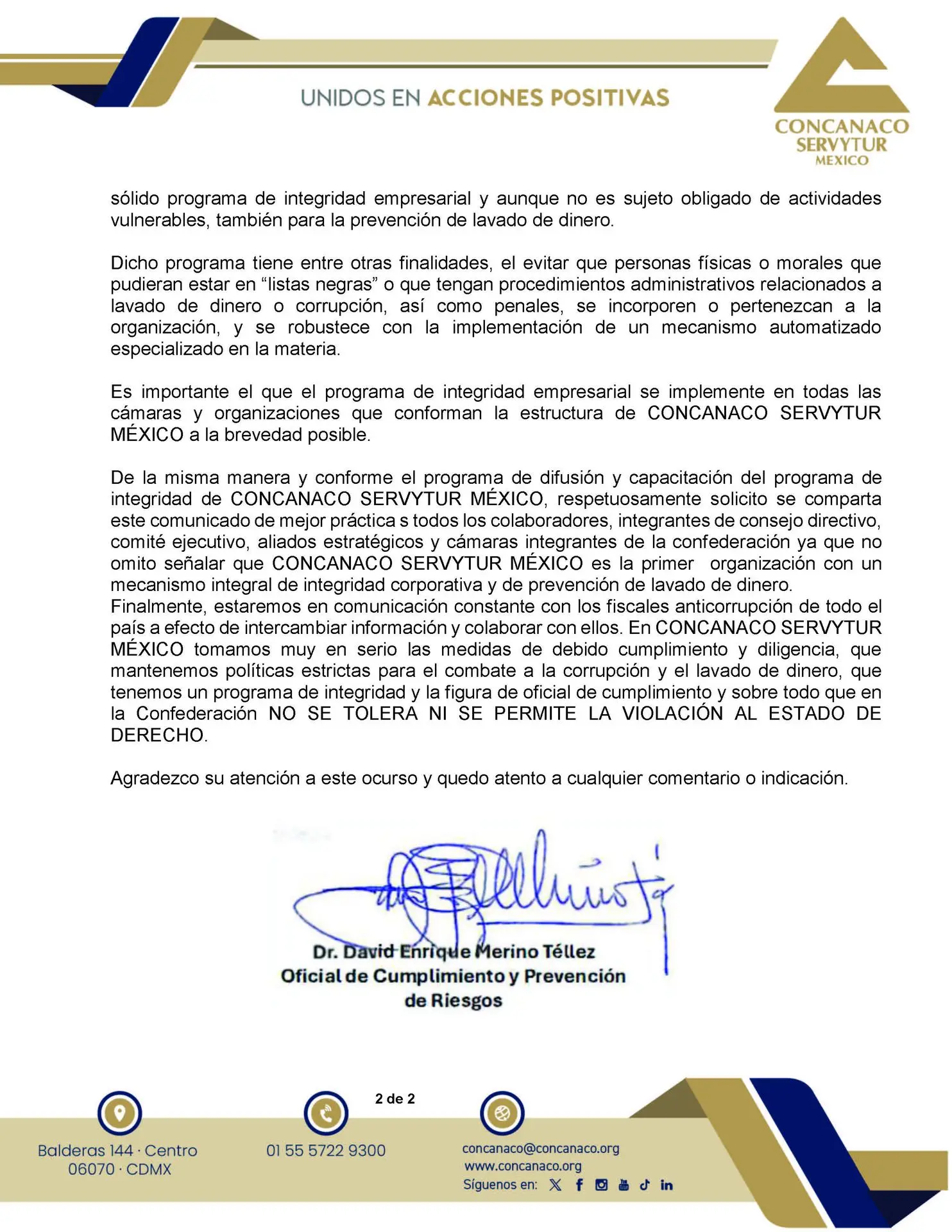 De la misma manera y conforme el programa de difusión y capacitación del programa de integridad de CONCANACO SERVYTUR MÉXICO, respetuosamente solicito se comparta este comunicado de mejor práctica s todos los colaboradores, integrantes de consejo directivo, comité ejecutivo, aliados estratégicos y cámaras integrantes de la confederación ya que no omito señalar que CONCANACO SERVYTUR MÉXICO es la primer organización con un mecanismo integral de integridad corporativa y de prevención de lavado de dinero.