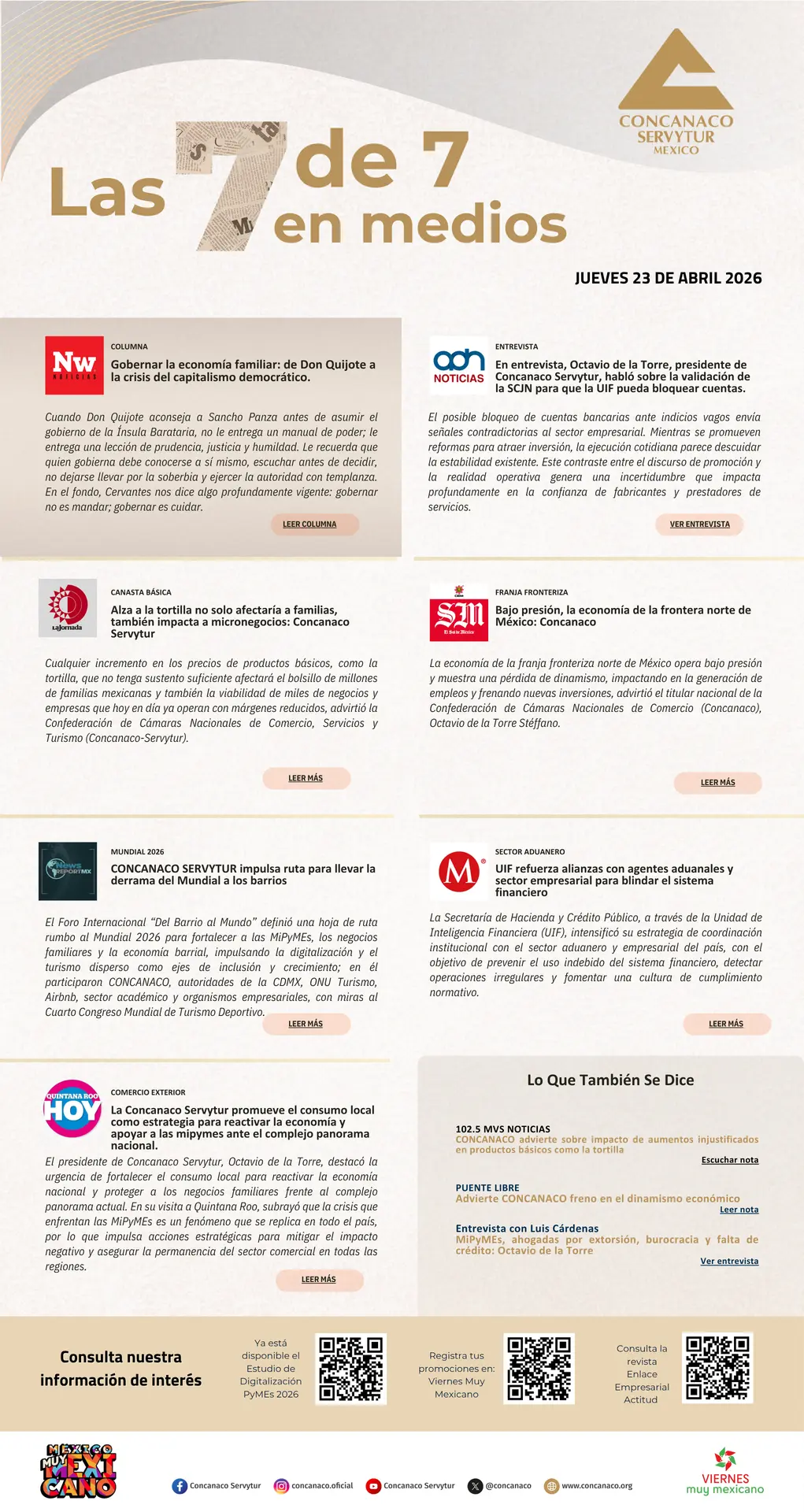 El presidente de la Concanaco Servytur, Octavio de la Torre de Stéffano, destacó la urgencia de fortalecer el consumo local para reactivar la economía nacional y proteger a los negocios familiares frente al complejo panorama actual. En su visita a Quintana Roo, subrayó que la crisis que enfrentan las MiPyMEs es un fenómeno que se replica en todo el país, por lo que la Confederación impulsa acciones estratégicas para mitigar el impacto negativo y asegurar la permanencia del sector comercial en todas las regiones.
