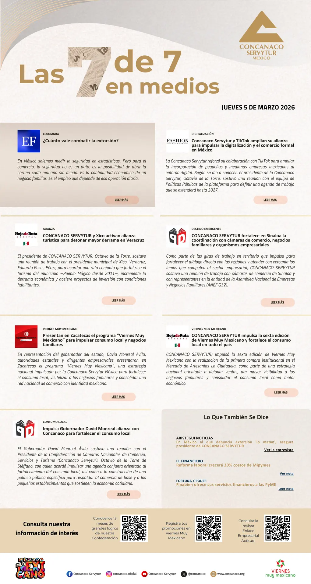 En representación del gobernador del estado, David Monreal Ávila, autoridades estatales y dirigentes empresariales presentaron en Zacatecas el programa “Viernes Muy Mexicano”, una estrategia nacional impulsada por la Confederación de Cámaras Nacionales de Comercio, Servicios y Turismo (Concanaco Servytur) para fortalecer el consumo local, visibilizar a los negocios familiares y consolidar una red nacional de comercio con identidad mexicana.