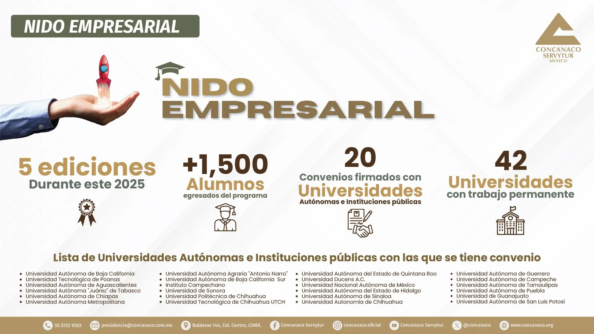 Durante 2025, esta iniciativa impulsada por CONCANACO SERVYTUR logró consolidar su presencia en diversas instituciones de educación superior, brindando a los estudiantes herramientas para transformar ideas en proyectos productivos y fortalecer el ecosistema empresarial.