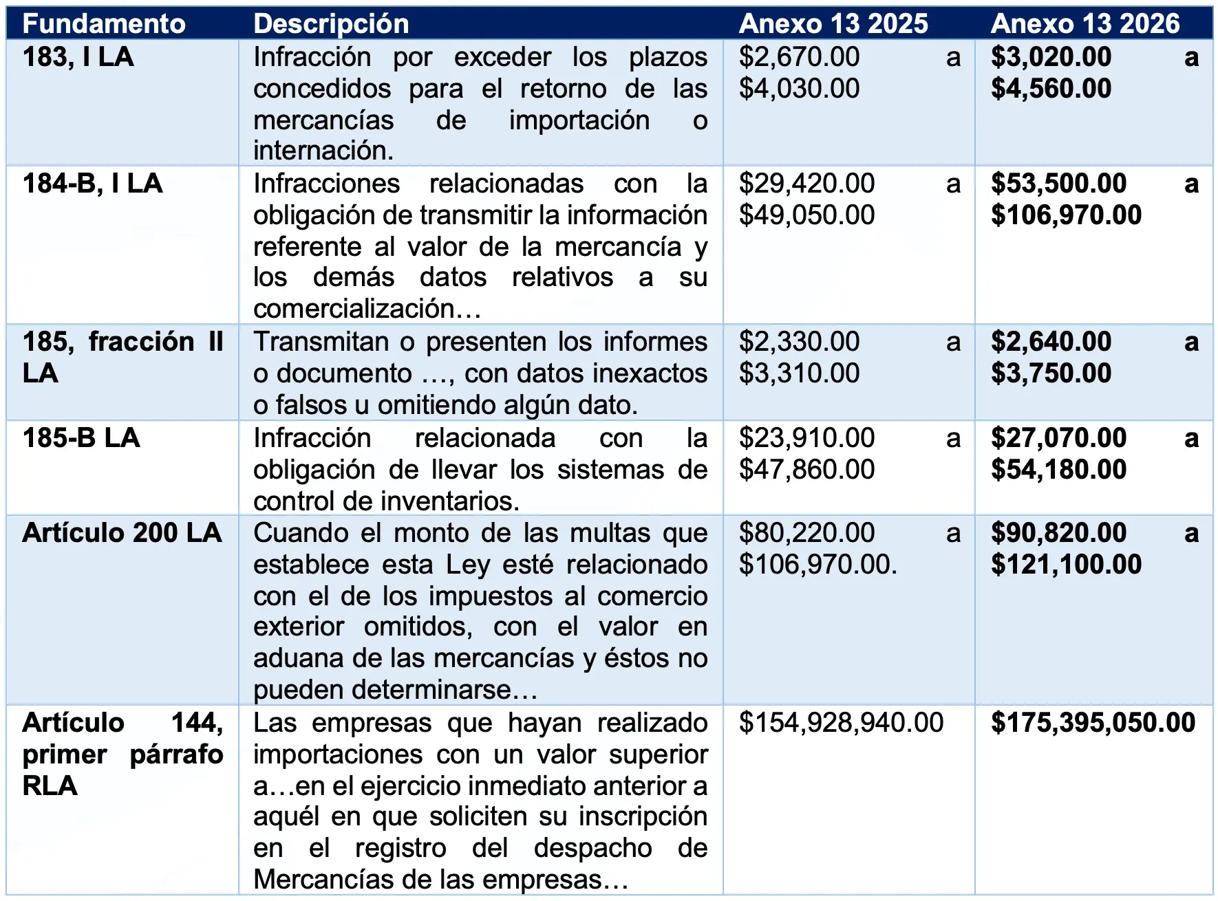 - En este anexo se dan a conocer las multas y cantidades actualizadas para 2026 establecidas en la Ley Aduanera y su Reglamento. Por ejemplo: