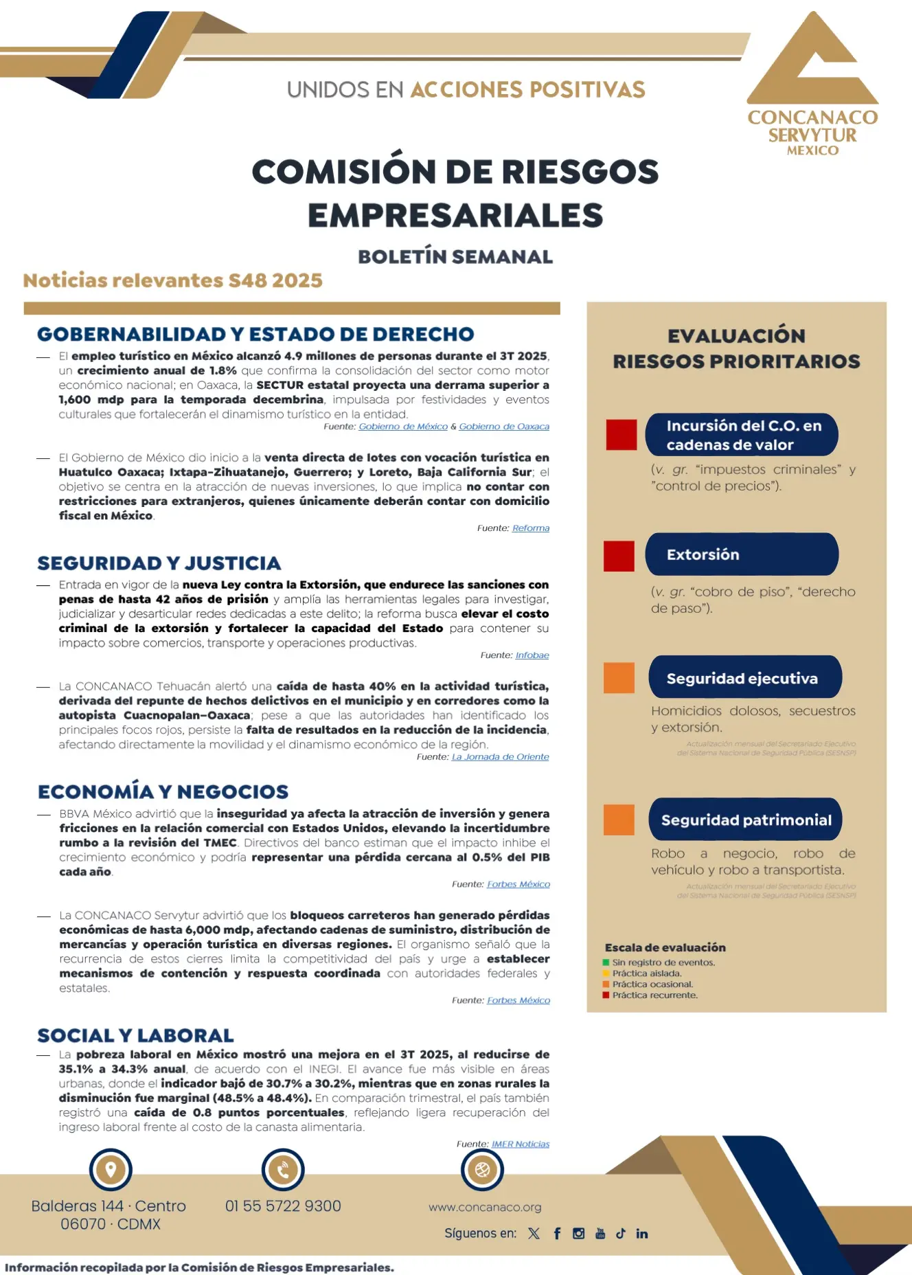 La CONCANACO Servytur advirtió que los bloqueos carreteros han generado pérdidas económicas de hasta 6,000 mdp, afectando cadenas de suministro, distribución de mercancías y operación turística en diversas regiones. El organismo señaló que la recurrencia de estos cierres limita la competitividad del país y urge a establecer mecanismos de contención y respuesta coordinada con autoridades federales y estatales.