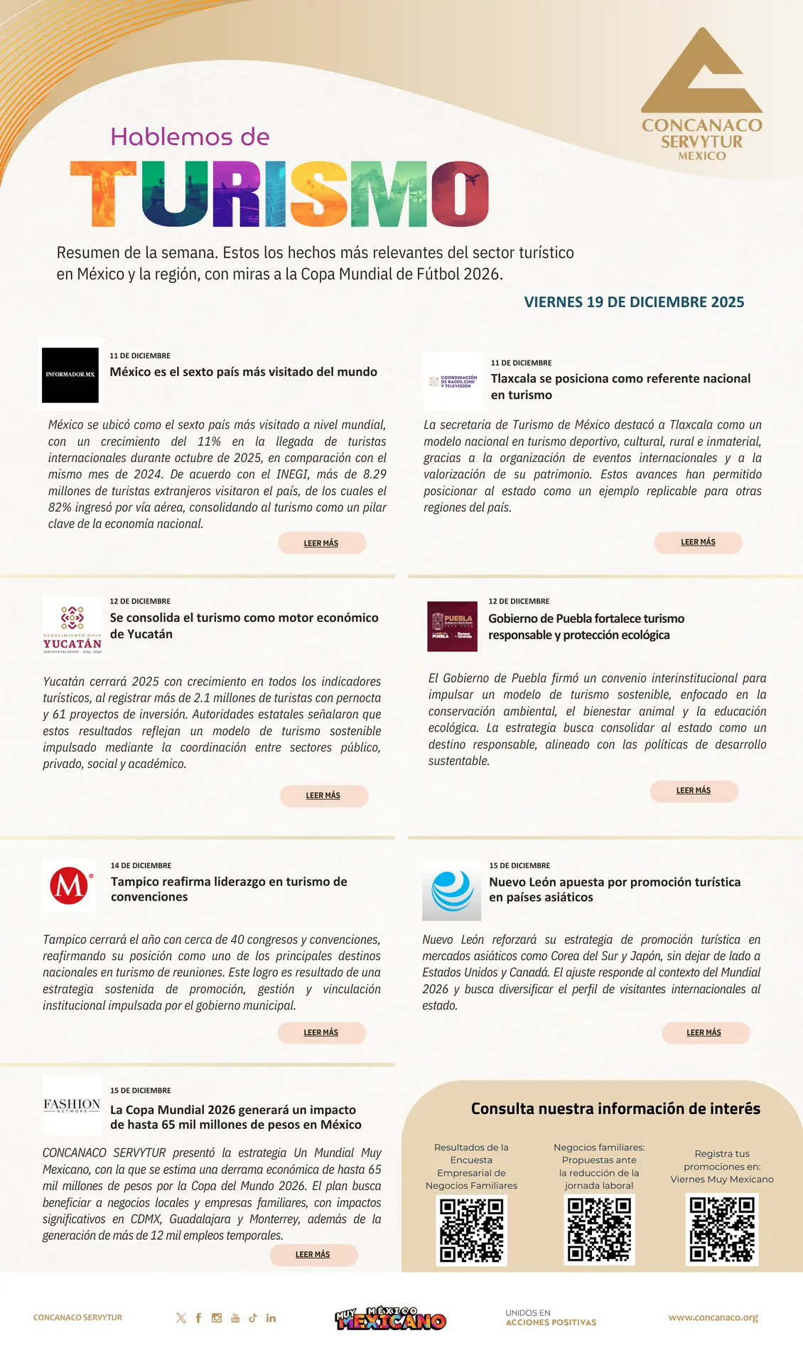 CONCANACO SERVYTUR presentó la estrategia Un Mundial Muy Mexicano, con la que se estima una derrama económica de hasta 65 mil millones de pesos por la Copa del Mundo 2026. El plan busca beneficiar a negocios locales y empresas familiares, con impactos significativos en CDMX, Guadalajara y Monterrey, además de la generación de más de 12 mil empleos temporales.