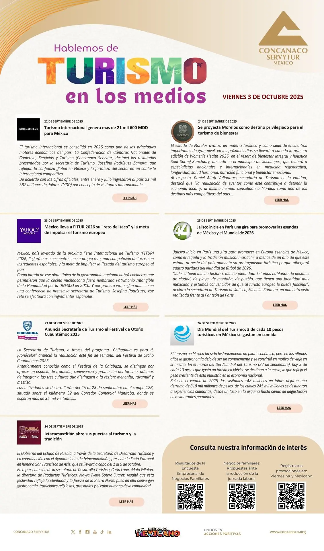 El turismo internacional se consolidó en 2025 como uno de los principales motores económicos del país. La Confederación de Cámaras Nacionales de Comercio, Servicios y Turismo (Concanaco Servytur) destacó los resultados presentados por la secretaria de Turismo, Josefina Rodríguez Zamora, que reflejan la confianza global en México y la fortaleza del sector en un contexto internacional competitivo.