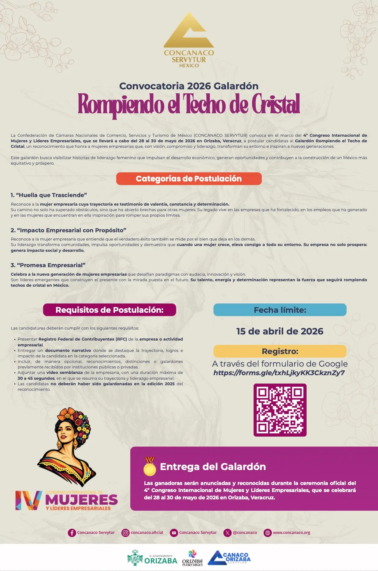 La convocatoria se realiza en el marco del IV Congreso Internacional de Mujeres y Líderes Empresariales, que se llevará a cabo del 28 al 30 de mayo de 2026 en Orizaba, Veracruz.
