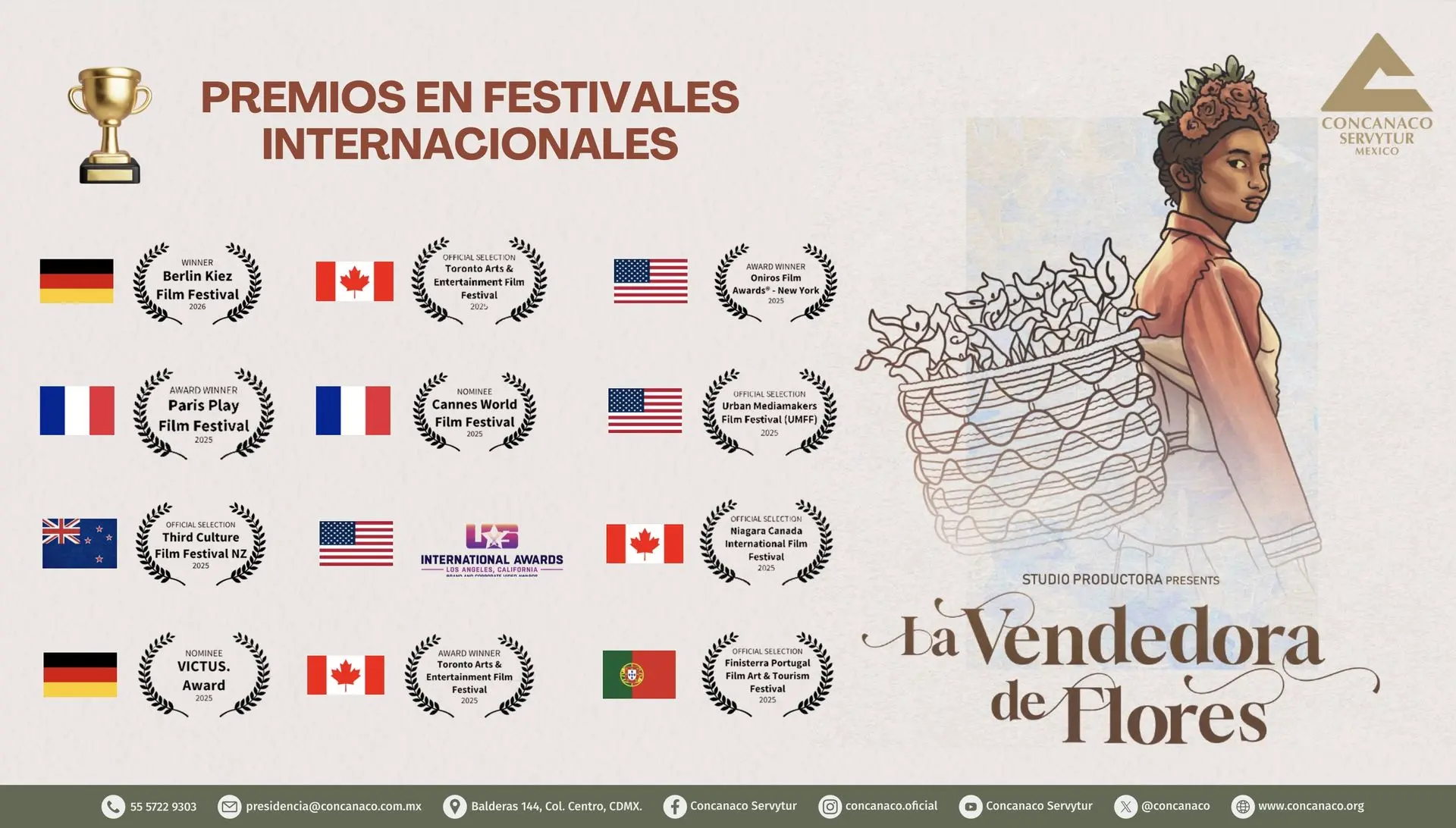 Desde su estreno, “La Vendedora de Flores” ha sido reconocida en festivales internacionales como el Berlin Kiez Film Festival 2026 (Winner), el Paris Play Film Festival 2025 (Award Winner), los Oniros Film Awards – New York 2025 (Award Winner) y el Toronto Arts & Entertainment Film Festival 2025, además de selecciones oficiales en certámenes de Canadá, Francia, Portugal, Estados Unidos, Alemania y Nueva Zelanda.