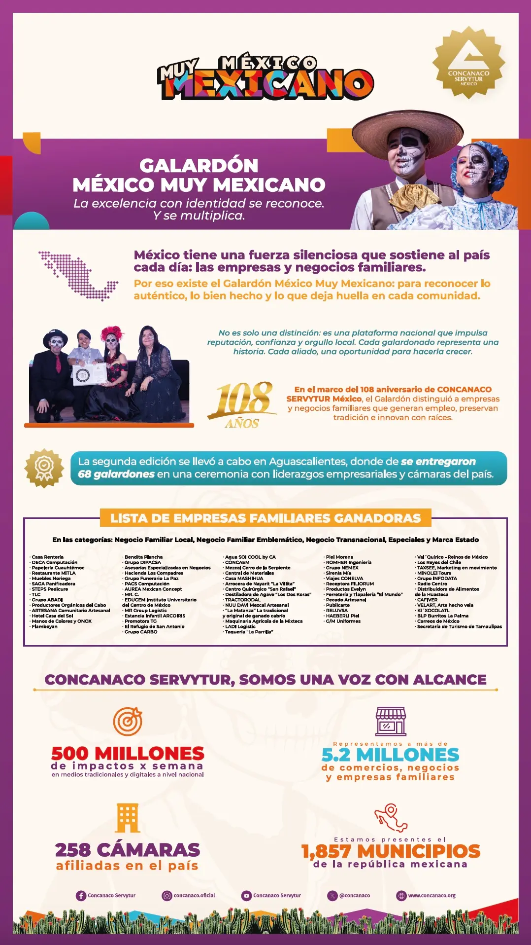 En ese marco, CONCANACO SERVYTUR instauró el Reconocimiento México Muy Mexicano para celebrar a las empresas y negocios que son corazón y motor del país: organizaciones que convierten desafíos en oportunidades y reflejan la esencia de México en cada producto y servicio, destacando su creatividad, calidad y autenticidad, así como el trabajo de sus equipos.